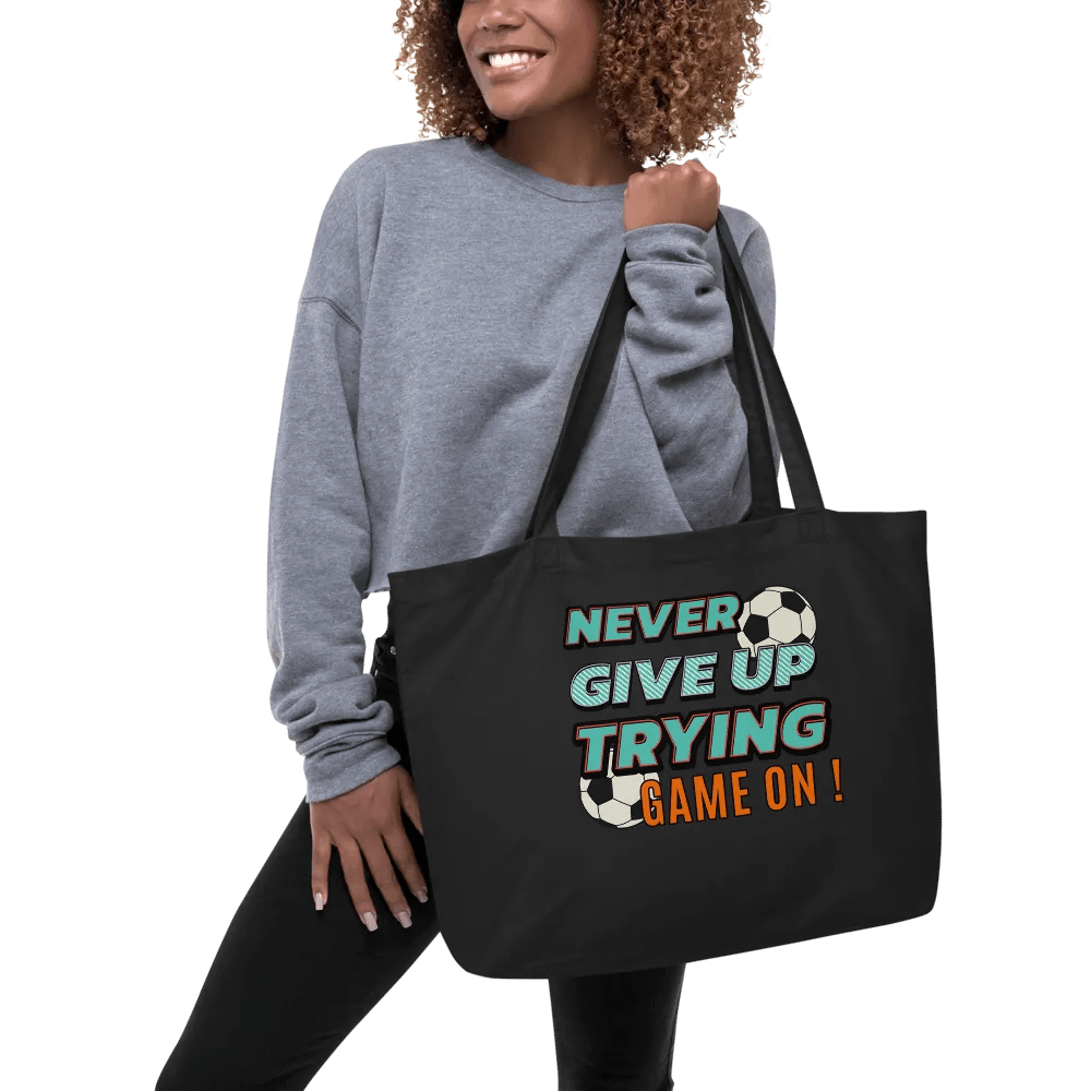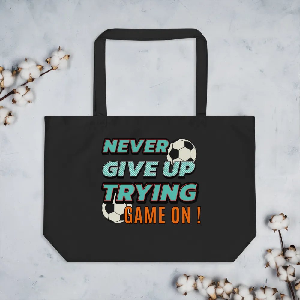 Carry your essentials in style with this eco-friendly organic cotton tote featuring bold, colorful text and soccer ball accents. Showcasing the inspiring words 'NEVER GIVE UP TRYING GAME ON!' this spacious tote is perfect for everyday use and making a statement.